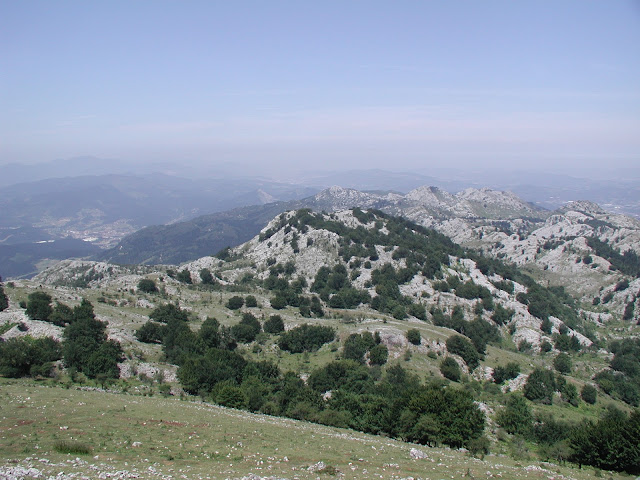 Hacia el SW, el cresterio Alluitz Anboto. Desde Alluitz se ve todo el cresterío y el Paso del Diablo desde una perspectiva desalentadora, al ser festivo había mucha gente en la cima del Alluitz viendo el paso, como si fuera un espectáculo. Solo por eso no continué por la cresta hacia Anboto. La actitud de la gente que allí estaba es lo contrario a lo que yo entiendo que es el espíritu del alpinismo. Pienso que cuando en montaña se está corriendo un riesgo calculado, es un acto profundamente intimo, yo por eso huyo de la multitud y de las vías normales en la montaña.