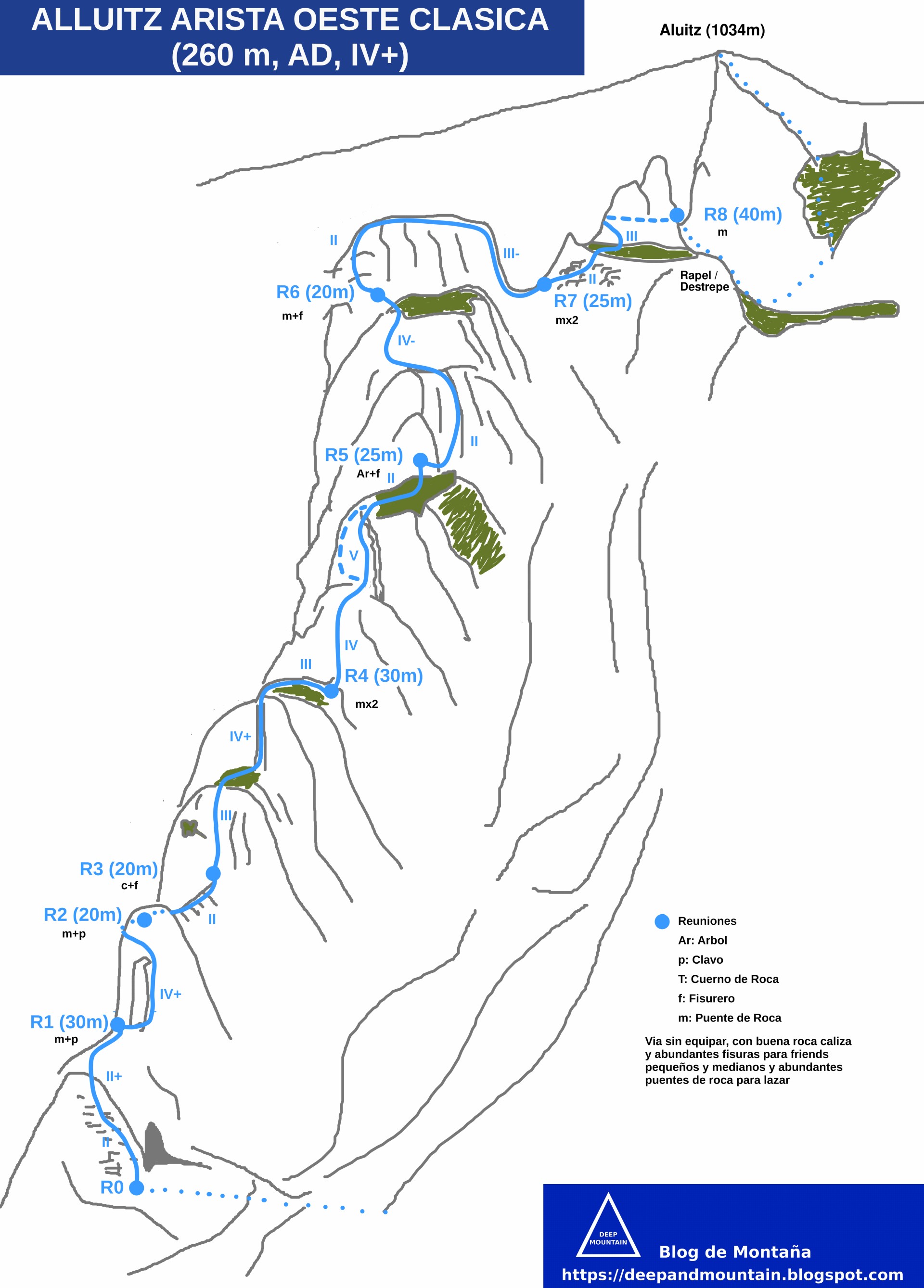 Desde la reunión, un poco hacia la izquierda, se trepa por un muro algo vertical pasando a la izda de un arbolito (III), donde hay que ir con precaución, debido a bloques rotos y descompuestos. Hay que comprobar cada agarre para que no se suelte. A continuación se tumba algo la pendiente y aumenta la zona mixta mas herbosa y se protege con un friend a una grieta. Al de poco se protege con una cinta a un tronquito.Aquí se llega a la base de un resalte vertical de unos 3 mts, (IV) que en su primera mitad no tiene agarres de pies. Los únicas presas no son buenas para las manos obligando a empotrar y tirar de brazos. El segundo de cordada, para no petarse y reservar fuerzas para el resto de la vía, lo supera con el estribo a un clavo a unos 2 mts de la base del resalte. Este paso sería de un IV+. Hecho el paso en artificial se llega a una zona fácil tumbada de III-, protegida a un tronquito.